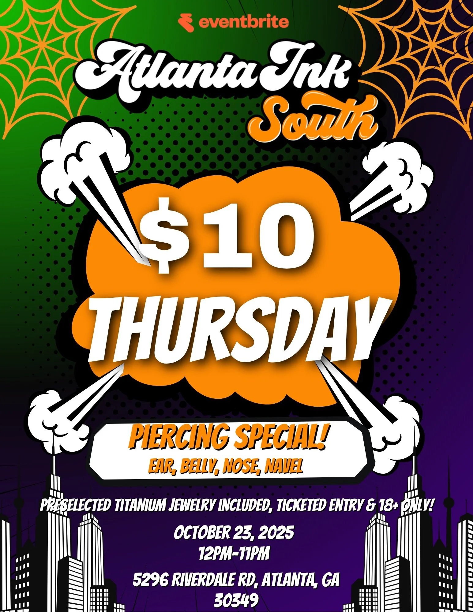 Get pierced for just $10 this Thursday! Preselected titanium jewelry included. Available piercings: nose, ears, nipple, and belly only. Must be 18+ to participate.